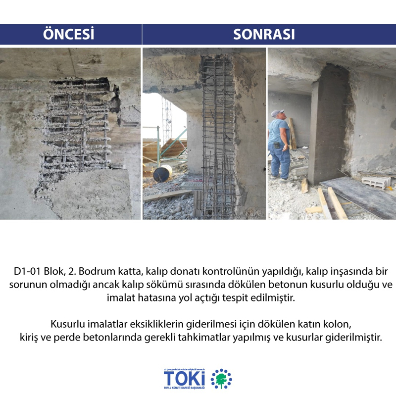 "Bu kapsamda kusurların giderilmesi amacıyla yapılan katın döşeme ve kolon perdelerinde kusurlu betonların kırımları yapılarak, sıfır tolerans ilkesine uygun olarak söz konusu imalatlar düzeltilmektedir. Hatalı imalatların tekrarlanmaması için beton santralinin reçetesinde yer alan malzemeler ve reçete oranları hakkında da gerekli önlemler alınmıştır. Yine söz konusu hatalı imalatı gerçekleştiren yüklenici firma ve müşavir hakkında tahkikat başlatılmıştır.