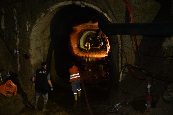 AFAD'a bağlı dalgıçlar, Jandarma Arama Kurtarma (JAK) ile belediyelere ait iş makinelerinin de destek verdiği çalışmalarda, 4 metre yükseklik ve 400 metre uzunluğundaki tünelin içinde biriken su, balçık ve moloz yığınlarının tahliyesine çalışılıyor.