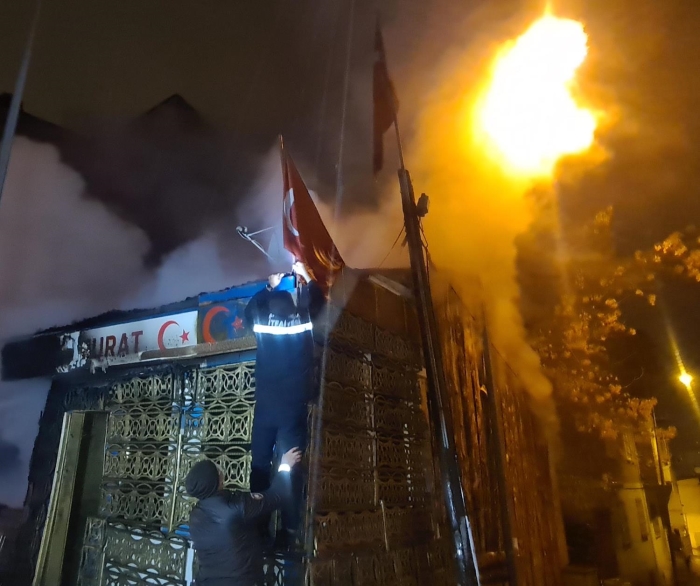 Yangın, dün saat 18.00 sıralarında Yakutiye ilçesi Kurtuluş Mahallesi Topdağı Caddesi'ndeki Kavak Mahalleliler Yardımlaşma ve Dayanışma Derneği'nin ahşap binasında meydana geldi. Sağanak sonrası dernek binasında çıkan yangın, kısa sürede büyüdü. İhbar üzerine olay yerine gelen Erzurum Büyükşehir Belediyesi İtfaiye Daire Başkanlığı ekipleri, kimsenin içinde olmadığı ahşap binaya balta ve kazma kullanarak girip alevlere müdahale etti. Bu sırada tek katlı binanın çatısındaki 2 Türk bayrağını gören ekipler, sepetli itfaiye aracı ile çıkıp ipleri kesti. 2 itfaiye eri, aldıkları Türk bayraklarını indirip muhafaza etti. İçerisinde malzeme bulunan binadaki alevler söndürülürken, polis ekipleri de yangın ile ilgili soruşturma başlattı.