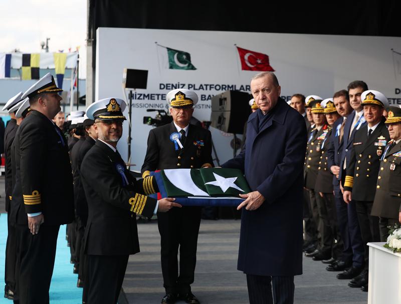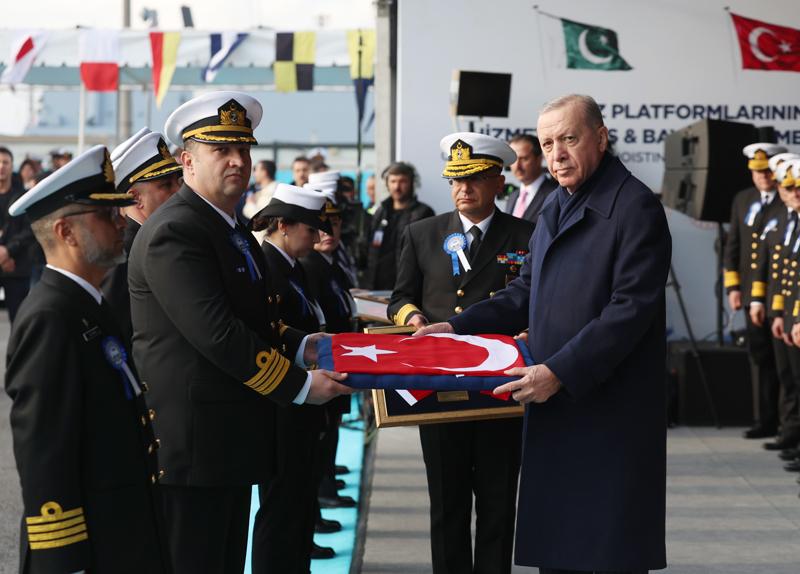 Deniz Platformlarımızın Hizmete Giriş, Bayrak Çekme ve İlk Sac Kesim Töreni'nde açıklamalarda bulunan Cumhurbaşkanı Erdoğan, 'Bugün Türk donanmasının gurur günü. Ülkemizin tersanelerine güvenmekte haklıyız. Savunmada başarı ancak bütüncül bir stratejiyle elde edilir, havada güçlü olmadan, denizde etkin olmadan karada caydırıcı olamazsınız, hamdolsun biz tüm bu alanlarda çok güçlü bir varlık gösteriyoruz. Güvenlik kuvvetlerimiz kendi ürettiğimiz araç, ekipman ve mühimmatla havada, karada ve denizde adeta destan yazıyor. Başka müjdelerimiz olacak. Karada, denizde, havada ve elbette siber vatanda caydırıcılığımızı artıracak projeleri tek tek devreye alacağız.' ifadelerini kullandı.