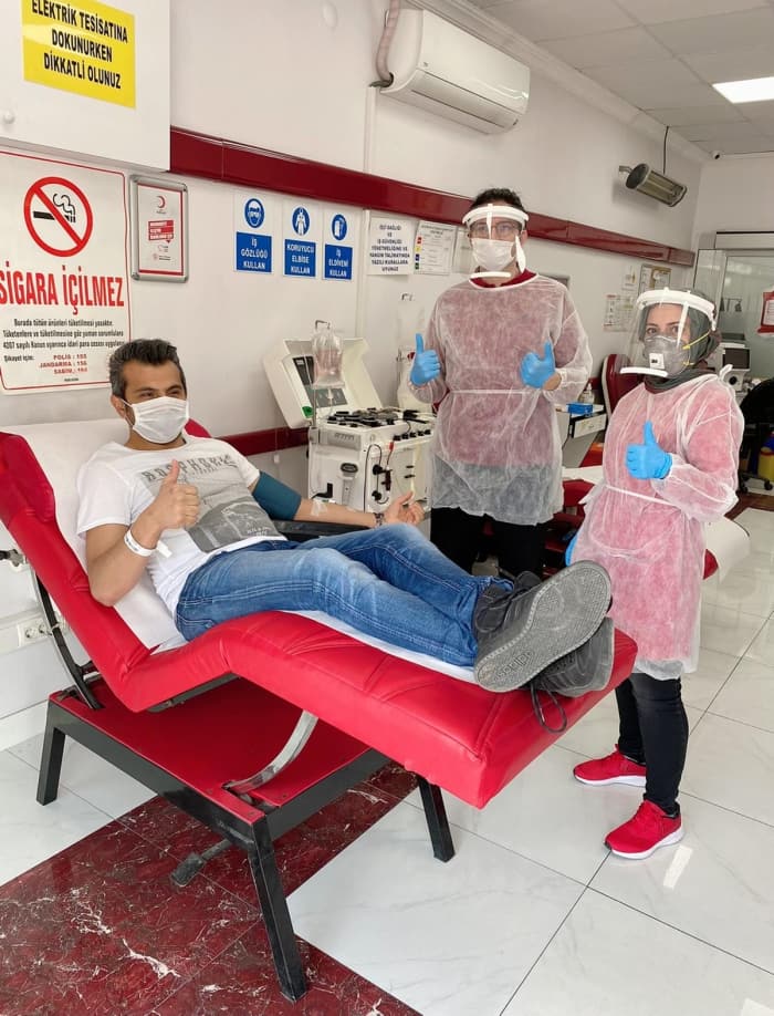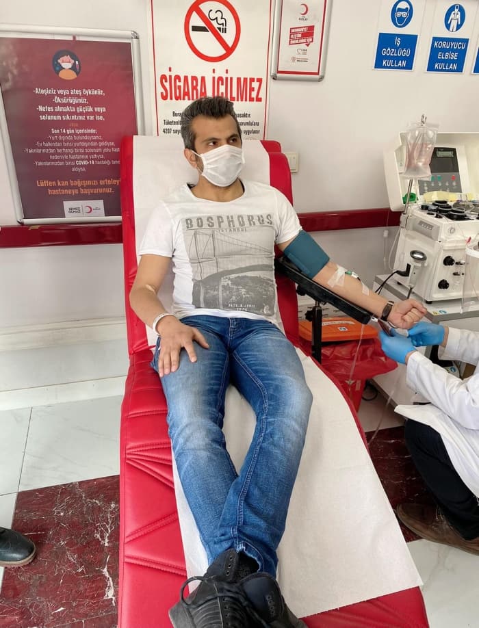 Kovid-19'a yakalanmış ve iyileşme sürecini tamamlamış 33 yaşındaki mühendis Salih Doğu, Hunat Kan Alma Merkezi'ne gelerek immün plazma bağışında bulundu.