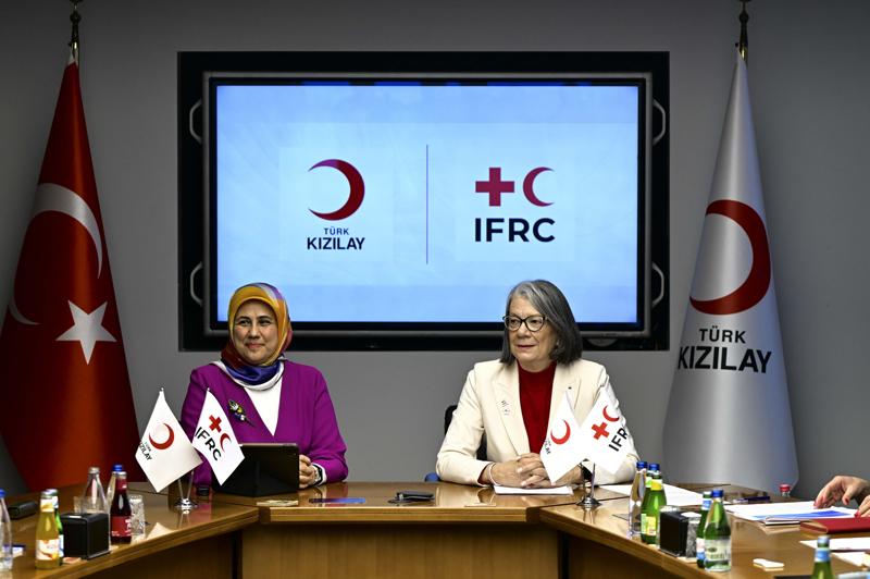 Yılmaz ve IFRC Başkanı Kate Forbes, Türk Kızılay Genel Merkezinde, İstanbul'da açılacak lojistik merkezine ilişkin basın toplantısı düzenledi.