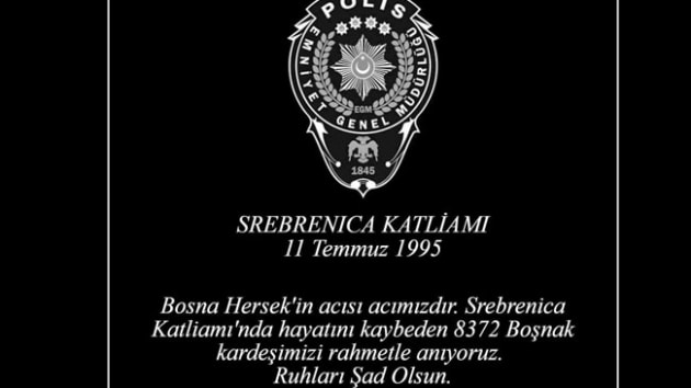 Türk Polis Teşkilatı, Avrupa'da, İkinci Dünya Savaşı'nın ardından yaşanan en büyük insanlık trajedisi olarak nitelendirilen ve 8 binden fazla Boşnak'ın katledildiği Srebrenitsa soykırımı ile ilgili paylaşım yaptı. Mesajda "Bosna Hersek'in acısı acımızdır. Srebrenica Katliamı'nda hayatını haybeden 8372 Boşnak kardeşimizi rahmetle anıyoruz. Ruhları Şad Olsun" ifadeleri yer aldı.
