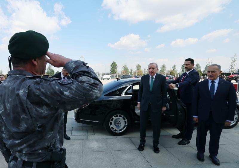 Erdoğan, Cumhurbaşkanlığı Külliyesi avlusunda, silahlı özel harekat polislerinden oluşan tören kıtasını selamladı.