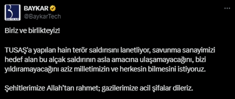 TUSAŞ'a yapılan hain terör saldırısını lanetliyor, savunma sanayimizi hedef alan bu alçak saldırının asla amacına ulaşamayacağını, bizi yıldıramayacağını aziz milletimizin ve herkesin bilmesini istiyoruz.