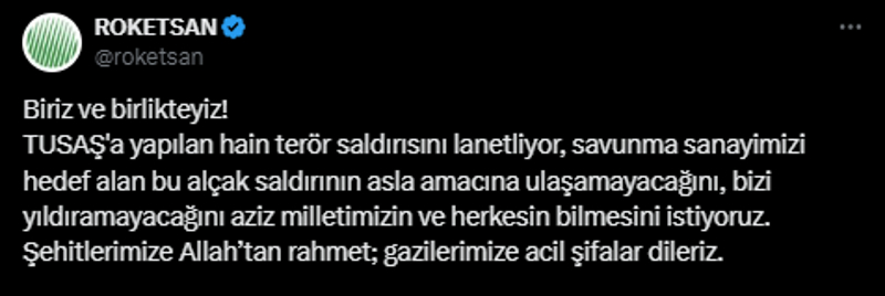 "Gerçekleştirilen saldırı sadece şirketimize yönelik değil, tüm savunma sanayimiz ve milletimize yönelik bir saldırıdır. Fakat her badireyi güçlü bir şekilde atlatan milletin bir evlatlarıyız. Bu saldırıyı da birlik ve beraberlik içerisinde atlatarak ülkemizin geleceğine yönelik ara vermeden çalışmaya devam edeceğiz. Saldırı sonucu şehit düşen mesai arkadaşlarımız ve bir vatandaşımıza Allah'tan rahmet, ailelerine ve milletimize başsağlığı, yaralılarımıza acil şifalar diliyoruz. TUSAŞ olarak şehitlerimizin hatırasını yaşatarak milli savunma sanayimize katkı sunmaya devam edeceğiz."