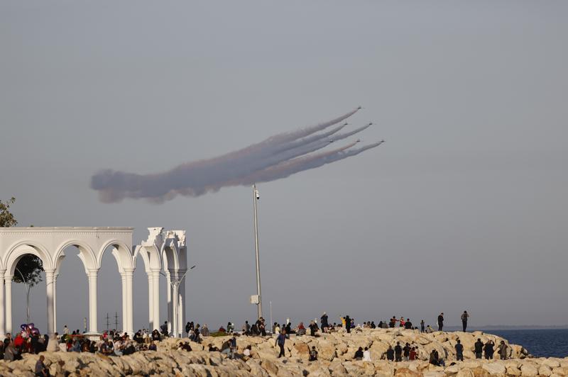 Adana'daki İncirlik Üssü'nden havalanan Türk Yıldızları'nı, sahil şeridindeki Mersin İdman Yurdu Meydanı'na gelen vatandaşlar izledi.