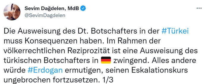 Cumhurbaşkanı Erdoğan'ın 10 büyükelçi hakkında istenmeyen adam ilan edilmelerini eleştiren Almanya Sol Parti Milletvekili Sevim Dağdelen, "Almanya da, Türk büyükelçiyi sınır dışı etsin" dedi.
