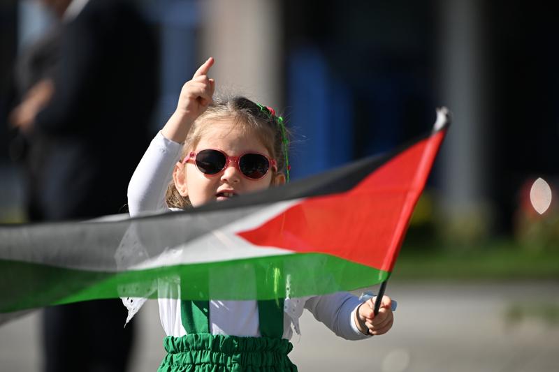 Kocaeli'de Türk ve Filistin bayraklarıyla İl Başkanlığı önüne gelen katılımcılar, el ele tutuşarak sessiz zincir oluşturdu.