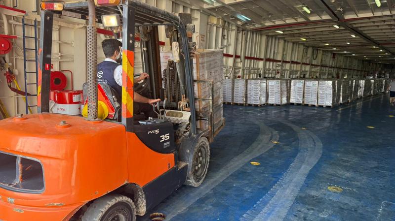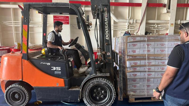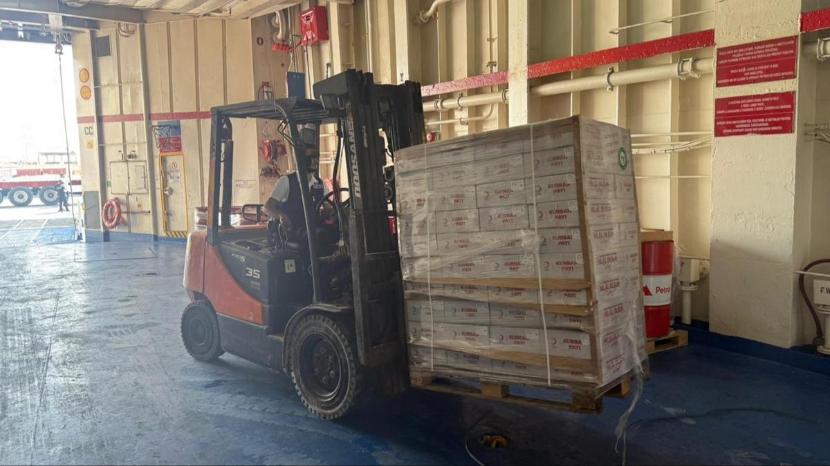 Afet ve Acil Durum Yönetimi Başkanlığı (AFAD) koordinasyonunda hazırlanan ve 17 sivil toplum kuruluşunun destekleriyle 14 Ekim'de Mersin Limanı'ndan yola çıkan gemideki yaklaşık 900 tonluk yardım malzemesi, forkliftler yardımıyla geminin kargo bölümünden çıkarılarak tırlara yükleniyor.