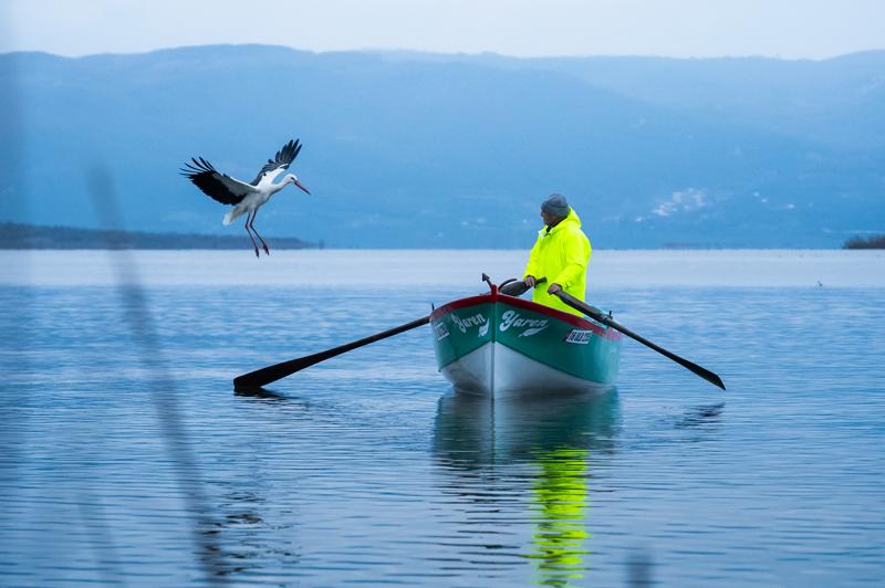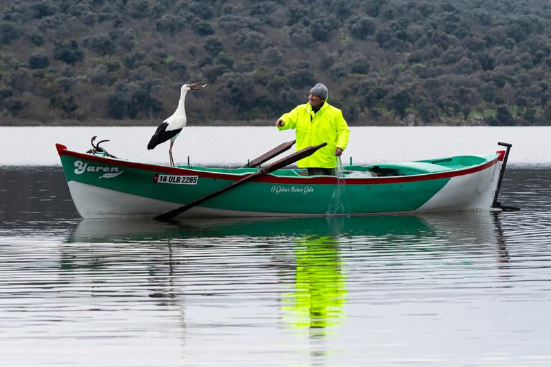 Yaren leyleğin, göl manzaralı yuvasının bulunduğu mahallede balıkçı Yılmaz'ın kayığındaki geleneksel pozu, doğa ve yaban hayatı fotoğrafçısı Alper Tüydeş tarafından kayda alındı.