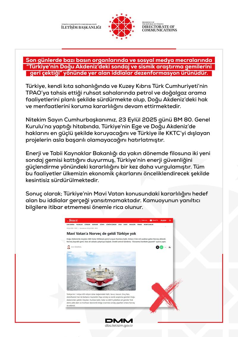 Enerji ve Tabii Kaynaklar Bakanlığı'nın yakın dönemde filosuna iki yeni sondaj gemisi katmasının, Türkiye'nin enerji güvenliğini güçlendirme yönündeki kararlılığını bir kez daha gösterdiği ifade edilen açıklamada, "Tüm bu faaliyetler ülkemizin ekonomik çıkarlarını önceliklendirecek şekilde kesintisiz sürdürülmektedir. Sonuç olarak; Türkiye'nin Mavi Vatan konusundaki kararlılığını hedef alan bu iddialar gerçeği yansıtmamaktadır. Kamuoyunun yanıltıcı bilgilere itibar etmemesi önemle rica olunur" denildi.