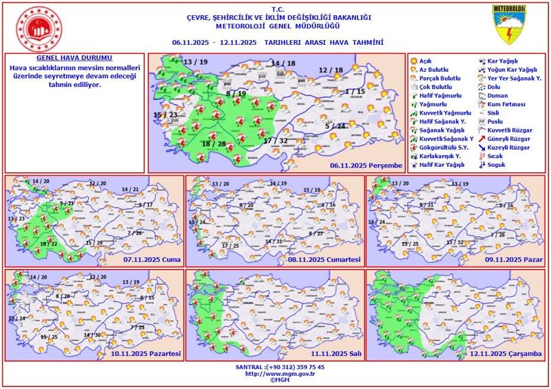 Yurt genelinde hava genellikle parçalı çok bulutlu olacak; Marmara'nın batısı, İç Ege, Batı Akdeniz, İç Anadolu'nun batısında sağanak ve gök gürültülü sağanak yağış etkili olacak.