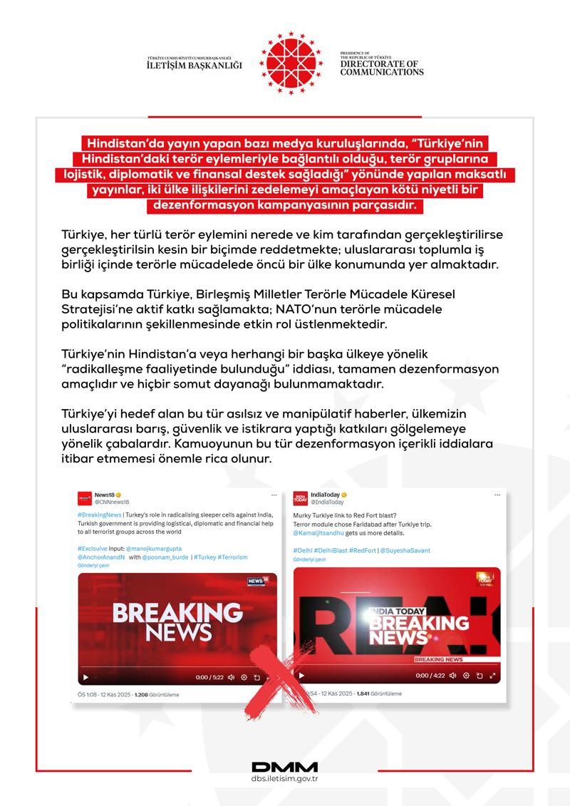 "Türkiye'nin Hindistan'a veya herhangi bir başka ülkeye yönelik 'radikalleşme faaliyetinde bulunduğu' iddiası, tamamen dezenformasyon amaçlıdır ve hiçbir somut dayanağı bulunmamaktadır. Türkiye'yi hedef alan bu tür asılsız ve manipülatif haberler, ülkemizin uluslararası barış, güvenlik ve istikrara yaptığı katkıları gölgelemeye yönelik çabalardır. Kamuoyunun bu tür dezenformasyon içerikli iddialara itibar etmemesi önemle rica olunur."