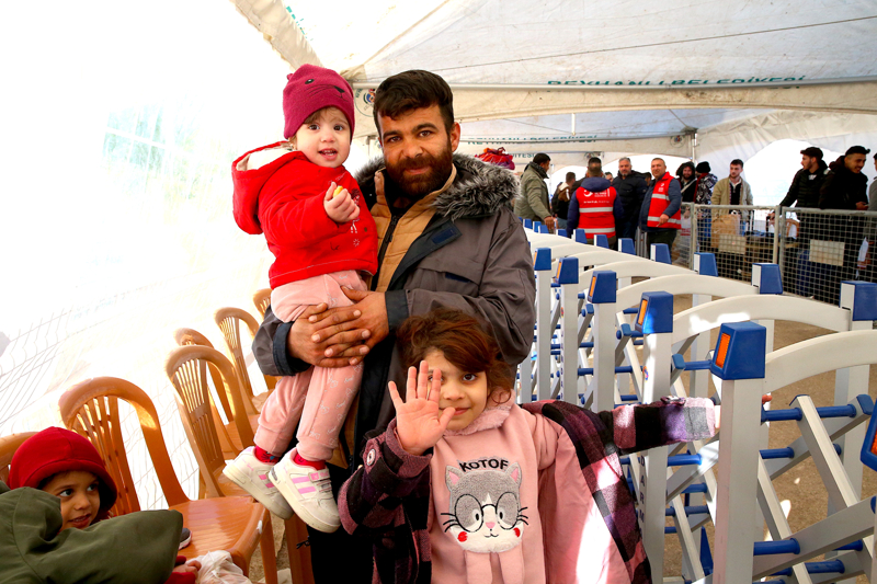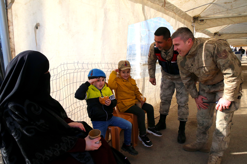 Kadın ve çocuklara geçiş önceliği tanıyan ekipler, ailelerinin işlemlerinin sürdüğü sırada çocuklarla yakından ilgileniyor.
