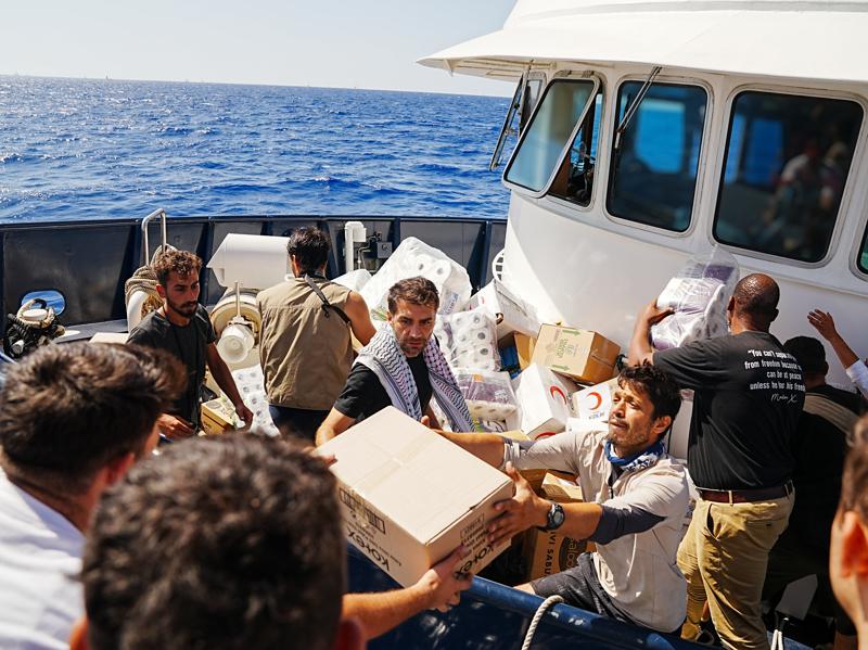 Türk Kızılay ekibi, Deniz Kuvvetleri Komutanlığına ait hücumbotlar ile teknelere ulaşarak gıda ve ilaç yardımlarını teslim etti.
