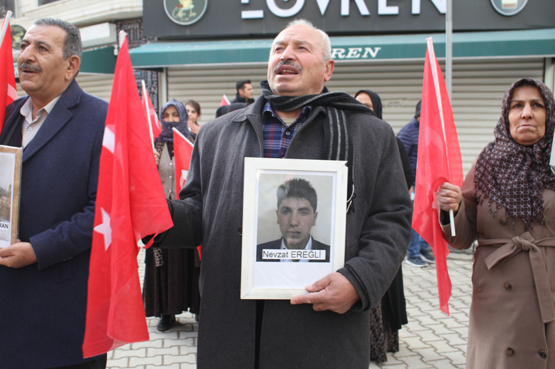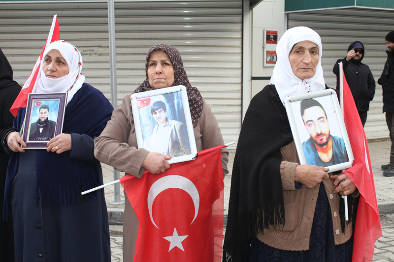 Menekşe Sokak'ta bir araya gelen aileler, Türk bayrakları ve evlatlarının fotoğraflarını taşıyarak, DEM Parti İl Başkanlığı binasının önüne kadar yürüdü.