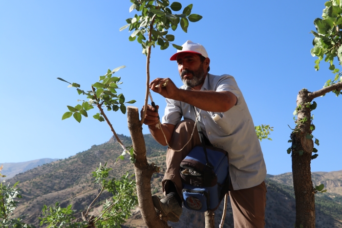 Pöge, "Aileme katkı için yaz mevsimlerinde aşılama yapıyorum. Dağlardaki fıstık ağaçlarına önce budama, yaz mevsiminde de aşılama yapıyoruz." diye konuştu.