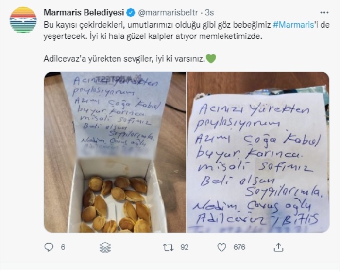 Marmaris Belediyesi, sosyal medya hesabından, Çavuşoğlu'nun notu ve gönderdiği kayısı çekirdeklerinin fotoğrafını paylaşarak, "Bu kayısı çekirdekleri, umutlarımızı olduğu gibi göz bebeğimiz Marmaris'i de yeşertecek. İyi ki hala güzel kalpler atıyor memleketimizde. Adilcevaz'a yürekten sevgiler, iyi ki varsınız." ifadelerine yer verildi.