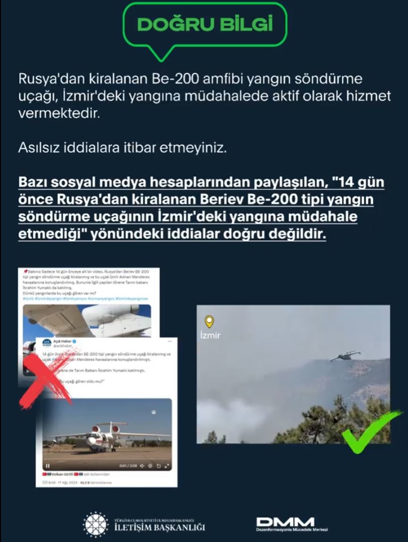 Cumhurbaşkanlığı İletişim Başkanlığı Dezenformasyonla Mücadele Merkezi (DMM), "14 gün önce Rusya'dan kiralanan Beriev Be-200 tipi yangın söndürme uçağının İzmir'deki yangına müdahale etmediği" iddialarının doğru olmadığını bildirdi.