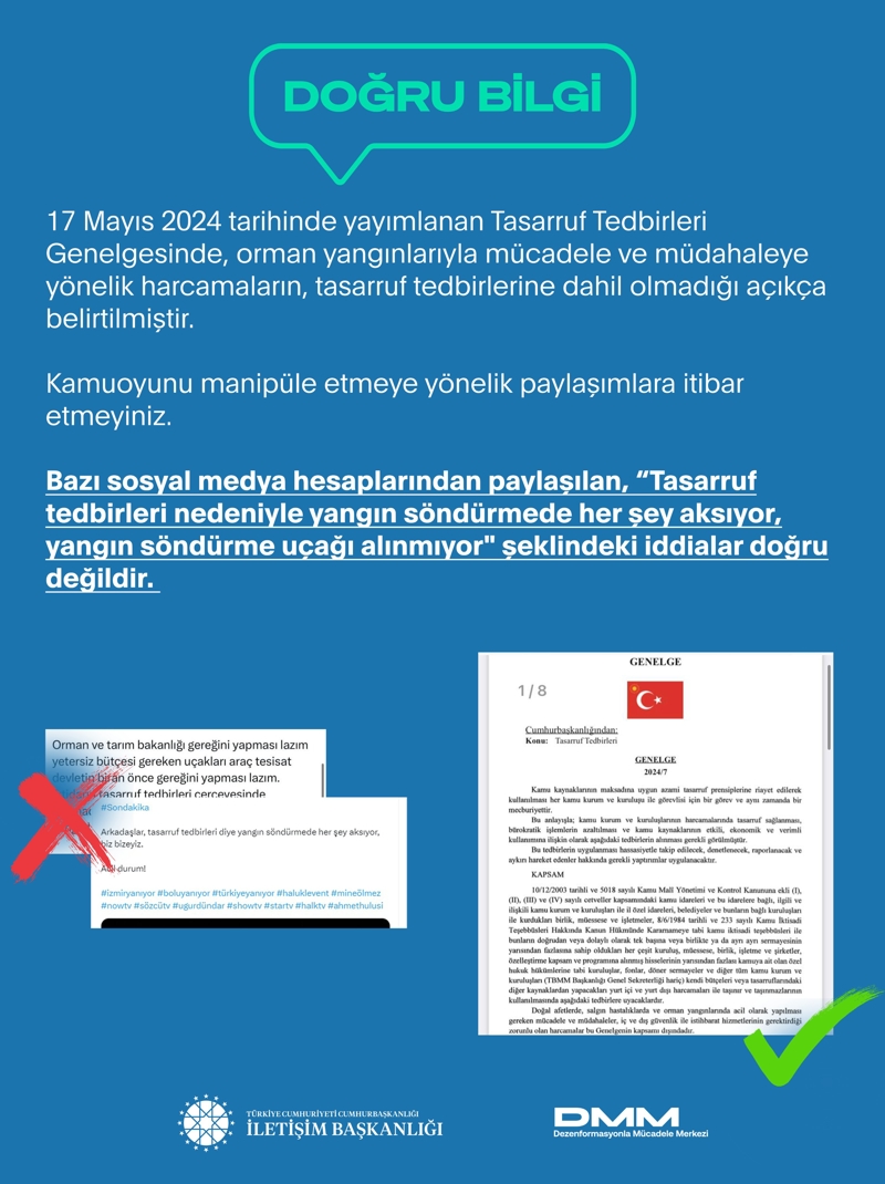 "17 Mayıs 2024 tarihinde yayımlanan Tasarruf Tedbirleri Genelgesinde, orman yangınlarıyla mücadele ve müdahaleye yönelik harcamaların, tasarruf tedbirlerine dahil olmadığı açıkça belirtilmiştir. Kamuoyunu manipüle etmeye yönelik paylaşımlara itibar etmeyiniz."