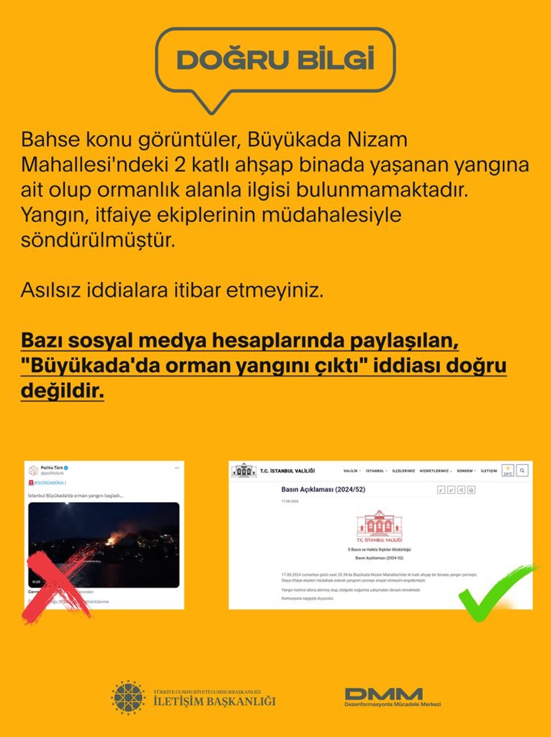 "Bahse konu görüntüler, Büyükada Nizam Mahallesi'ndeki 2 katlı ahşap binada yaşanan yangına ait olup ormanlık alanla ilgisi bulunmamaktadır. Yangın, itfaiye ekiplerinin müdahalesiyle söndürülmüştür. Asılsız iddialara itibar etmeyiniz."