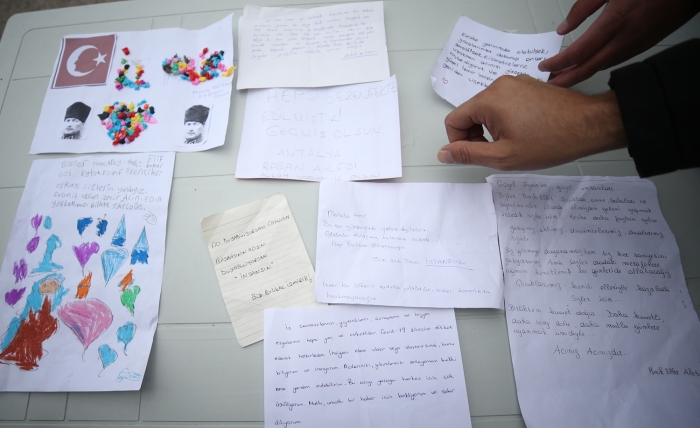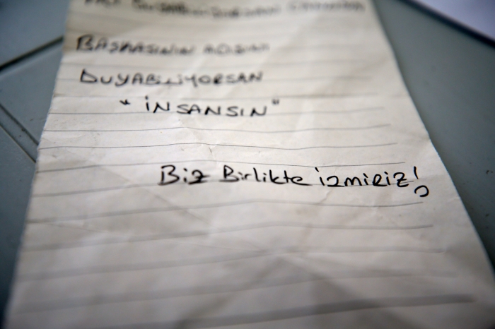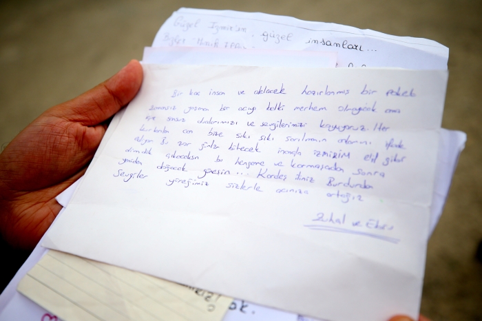 Kolileri açan görevlilerin bulduğu notlar arasında bulunan, "Acı duyabiliyorsan canlısın, başkasının acısını duyabiliyorsan insansın. Biz birlikte İzmir'iz", "Keşke yanınızda olabilsek. Yaralarınıza dokunup onları sarabilsek. Kilometrelerce uzaktan acılarınızı yürekten hissediyoruz ve biliyoruz ki güzel İzmir'imizin her yerinde çiçekler açacak", "Yaşadığınız acıya merhem olmayacak ama içine sonsuz dua ve sevgimizi koyuyoruz" gibi mesajlar duygusal anların yaşanmasına neden oluyor.