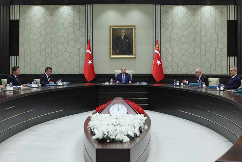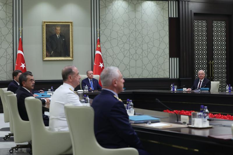 Cumhurbaşkanı Erdoğan, Şura kararlarını imzalarken Cumhurbaşkanı Yardımcısı Cevdet Yılmaz ve Milli Savunma Bakanı Yaşar Güler de hazır bulundu.