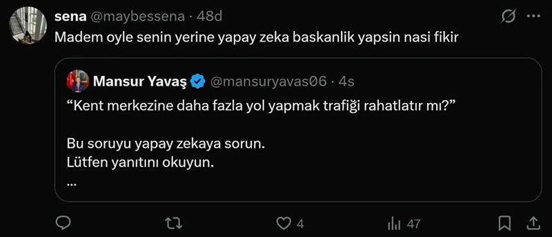 Somut bir adım göremeyen Ankaralılar, Yavaş'a tepkisini, "O zaman bırakın ChatGPT yönetsin belediyeyi Mansur Bey" ifadeleriyle dile getiriyor.