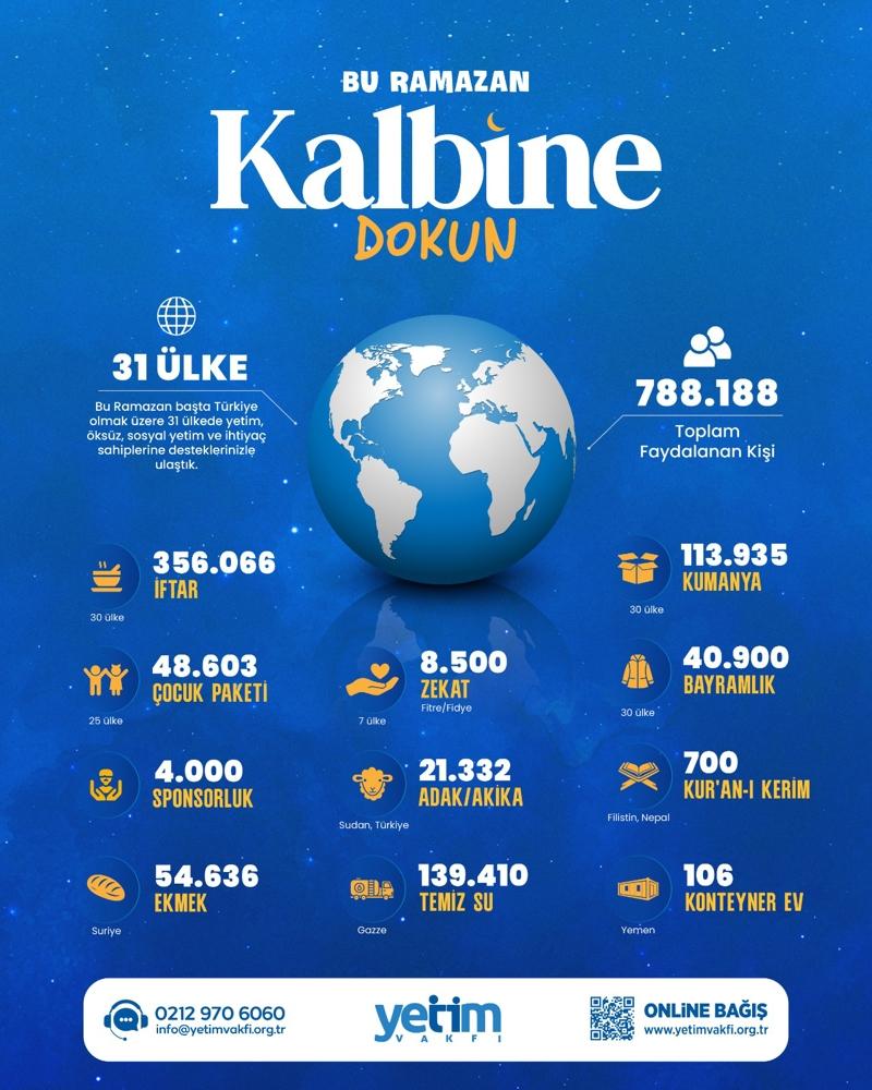 Yetim Vakfı, dünyanın birçok coğrafyasında aynı sofrada buluşamayan insanların aynı ihtiyacı hissettiği Ramazan ayında, ihtiyaç sahiplerine yönelik çok boyutlu destek programlarını tamamladı. Yürütülen faaliyetlerde savaş ve yoksulluktan etkilenen yetim çocuklar ve aileler öncelikli olarak desteklendi.