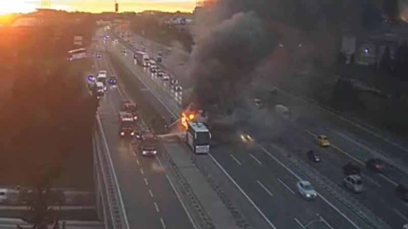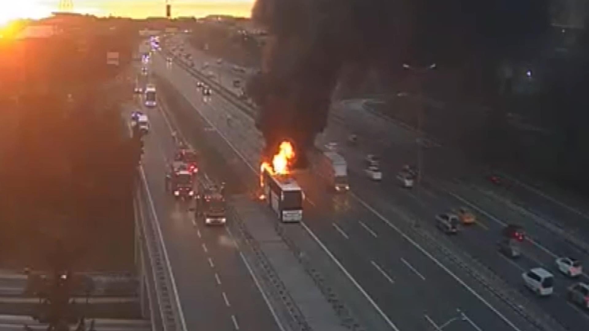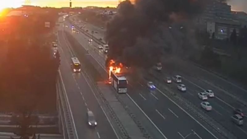 Ataşehir, TEM Otoyolu'nda yolcu otobüsünde yangın çıktı. Yangına itfaiye ekipleri müdahale ediyor.