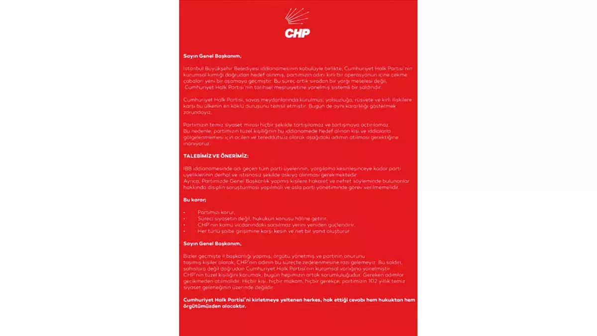 Mektupta, "İBB iddianamesinde adı geçen tüm parti üyelerinin, yargılama kesinleşinceye kadar parti üyeliklerinin derhal ve istisnasız şekilde askıya alınması gerekmektedir. Partimizde Genel Başkanlık yapmış kişilere hakaret ve nefret söyleminde bulunanlara disiplin soruşturması yapılmalıdır. Bu karar süreci siyasetin değil hukukun konusu haline getirir, CHP'nin kamu vicdanındaki sarsılmaz yerini yeniden güçlendirir, her türlü şaibe girişimine karşı kesin ve net bir yanıt oluşturur" ifadeleri yer aldı. Mektupta yolsuzluk sanığı İmamoğlu'nun partiden üstün tutulamayacağına vurgu yapılarak, "CHP'nin kişiler üzerine hiçbir kişi, hiçbir makam, hiçbir gerekçe, partimizin 102 yıllık temiz siyaset geleneğinin üzerinde değildir" denildi.