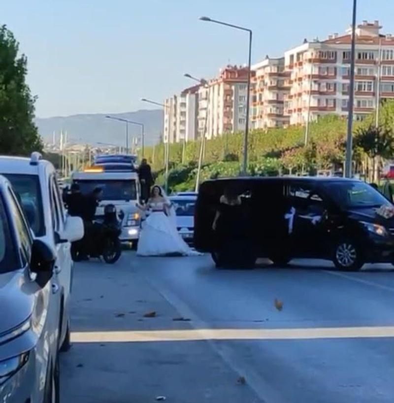 Bursa'nın Nilüfer ilçesi Fatih Sultan Mehmet Mahallesi'nde ilerleyen düğün konvoyu ana cadde üzerinde yolu kapattı. Araçtan inen gelin ve damat kimseye aldırış etmeden dakikalarca dans etti.