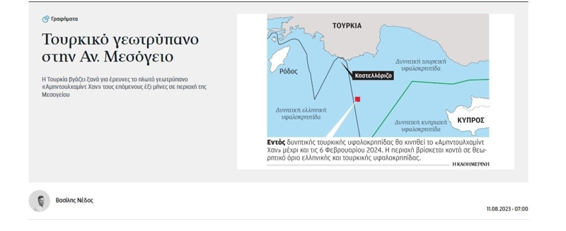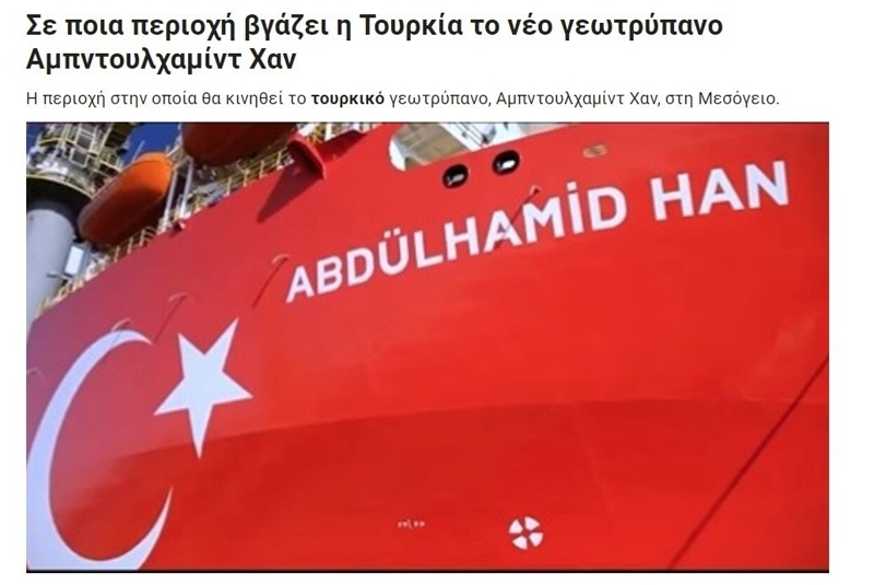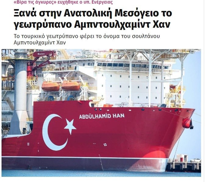 i-Eidiseis'in de gündeminde sondaj gemisi vardı. Yunanistan'ın merakla beklediği haberi duyuran gazete, "İşte Abdülhamid Han'ın görev alacağı yeni bölge" sözlerine yer verdi.
