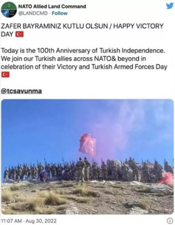 NATO Müttefik Kara Komutanlığı (LANDCOM) sosyal medya hesabından dün 30 Ağustos Zafer Bayramı'nın 100. yıl dönümünü kutlamak için paylaştığı gönderiyi Yunanistan'ın tepkisinin ardından sildi. Türk askerlerinin fotoğrafının bulunduğu gönderide, Milli Savunma Bakanlığının sosyal medya hesabı etiketlenerek Türkçe olarak, "Zafer Bayramınız kutlu olsun" denilmişti. Paylaşımın devamında İngilizce, "Bugün Türk bağımsızlığının 100. yıl dönümü. Zafer ve Türk Silahlı Kuvvetleri Günü kutlamalarında NATO ve ötesindeki Türk müttefiklerimizin yanındayız" ifadeleri kullanılmıştı.