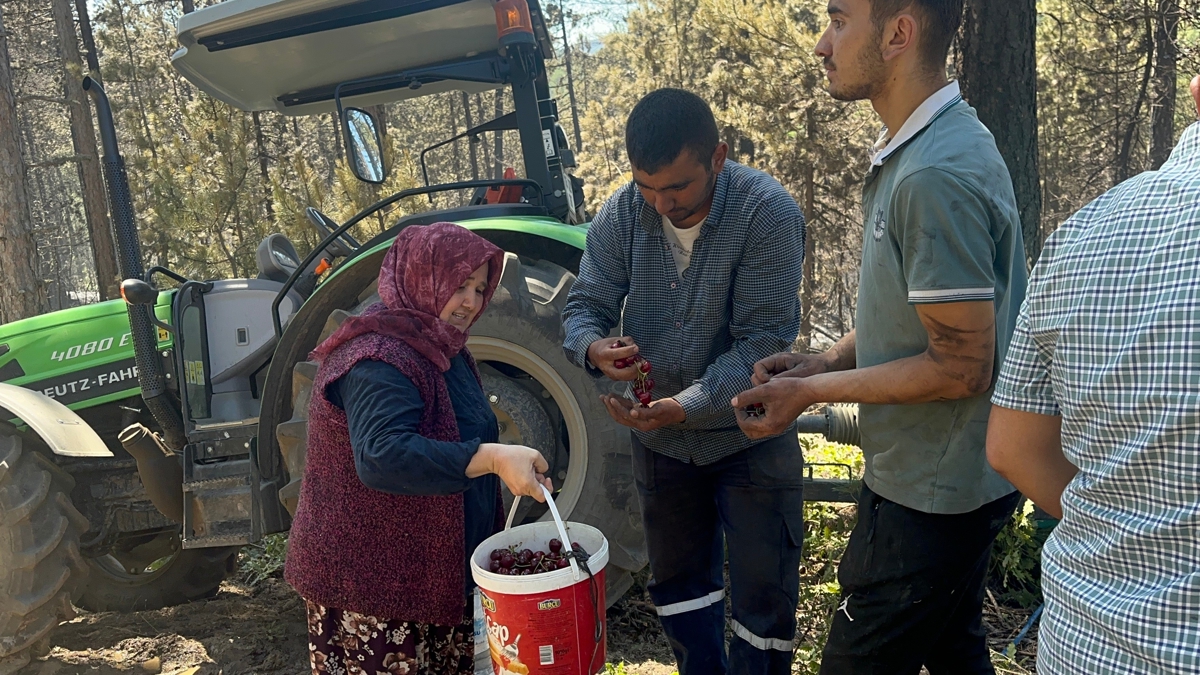 Eşinin de itfaiyeci olduğunu ifade eden Azime Ay, "Bende boğazları yanmıştır, dumandan etkilenmişlerdir diye kiraz ile su getirdi. Eşimde itfaiyeci. Bursa şehir merkezinde yaşıyorum. Burada kiraz bahçemiz var. Yangını duyunca yardımımız olsun diye koştuk geldik. Tüm ekiplere kiraz ve su veriyorum" dedi.