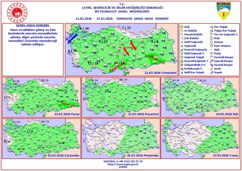 21 Mart 2026 hava durumu raporuna göre bayramın ilk gününden itibaren Türkiye genelinde etkili olacak sağanak yağış ve soğuk hava dalgasının yaklaşık 5 gün sürmesi bekleniyor.