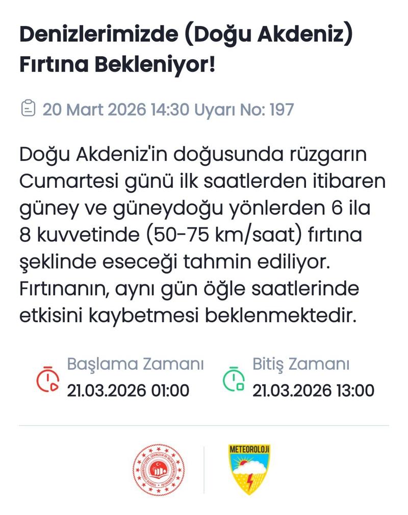 Meteoroloji Genel Müdürlüğü tarafından yapılan son değerlendirmelere göre: Ülkemiz genelinin çok bulutlu, Marmara, Kuzey ve iç Ege, Akdeniz, İç Anadolu, Batı Karadeniz, Orta Karadeniz'in iç kesimleri, Doğu Karadeniz, Doğu ve Güneydoğu Anadolu ile Ordu çevrelerinin aralıklı yağışlı geçeceği tahmin ediliyor. Yağışların genellikle yağmur ve sağanak yağışlı, Karadeniz'in iç kesimleri, Doğu Anadolu'nun kuzey ve doğusu ile Akdeniz, Ege ve İç Anadolu'nun kuzey kesimlerinin yükseklerinde karla karışık yağmur ve kar yağışı şeklinde olmak üzere, Diyarbakır, Mardin, Batman, Şırnak çevreleri, Bingöl ve Muş'un güneyi, Mersin, Adana, Hatay çevreleri ile Kahramanmaraş ve Osmaniye'nin batısında kuvvetli olması bekleniyor. Gece ve sabah saatlerinde iç kesimlerin yüksekleri ile doğusunda buzlanma ve don olayı bekleniyor. Rüzgarın, Marmara ve Kıyı Ege'de kuzeyli yönlerden; İç Anadolu'nun doğusunda Güneydoğulu yönlerden kuvvetli (40-60 km/sa) olarak eseceği bekleniyor. Doğu Karadeniz'in iç kesimlerinin yüksekleri ile Doğu Anadolu'nun yüksek kar örtüsüne sahip eğimli kesimlerinde çığ ve kar erimesi tehlikesi bulunmaktadır.