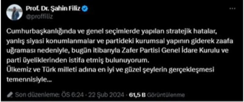 "Cumhurbaşkanlığında ve genel seçimlerde yapılan stratejik hatalar, yanlış siyasi konumlanmalar ve partideki kurumsal yapının giderek zaafa uğraması nedeniyle, bugün itibarıyla Zafer Partisi Genel İdare Kurulu ve parti üyeliklerinden istifa etmiş bulunuyorum. Ülkemiz ve Türk milleti adına en iyi ve güzel şeylerin gerçekleşmesi temennisiyle..."