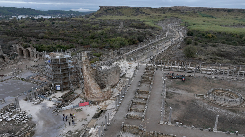 Bir dönem Pamfilya bölgesine başkentlik yaptığı bilinen ve Anadolu'daki en düzenli Roma dönemi kentlerinden biri olmasının yanı sıra mermer heykeltıraşlığıyla da ünlü kentte, 1946'dan beri kazı çalışmaları yürütülüyor.