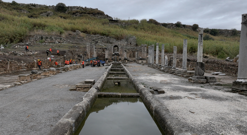 Antik çeşmenin o dönemde 3 kilometre uzaklıktaki nehir tanrısı olarakta bilinen Kestros Nehri'nden su kaynağını aldığını hatırlatan Dönmez, çeşmenin aktığı suyun 700 metre kanaldan loluşan lüks sayılacak havuzdan akıtıldığını anlattı.