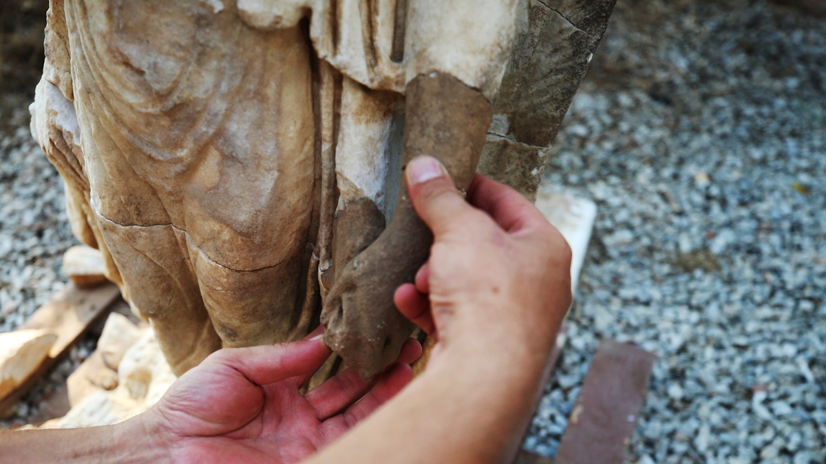 "Nike, yani zafer tanrıçasının bugün de bir el parçasını tamamladık. 35-40 parça tamamen elimizde. Pagan inanışın bir tanrıçası olan Nike, büyük ihtimalle Hristiyanlığın gelişiyle, kabul görmemeye başladı ve bugün bulunduğu bölüme atıldı. Bu atılma nedeniyle biraz tahribata uğramış. Biz de bu eserin restorasyonunu tamamlayınca Alanya Müzesi'ne kazandıracağız."