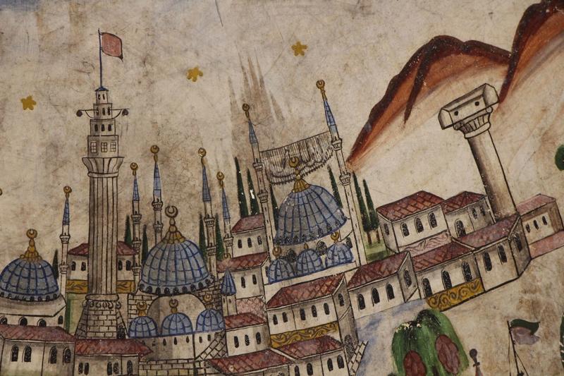Üç tarihi şehirden yerlerin resmedildiği eserde Galata ve Bayezid kuleleri arası, Haliç ile Galata köprüleri, Sultanahmet, Ayasofya, Süleymaniye camileri ve Çemberlitaş görülüyor. Bir caminin minaresine mahya asılmasıyla da Ramazan ayının coşkusu eserde yansıtılıyor.