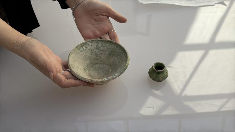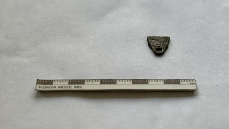 "Selçuklu dönemine ait olduğunu düşündüğümüz konut yapısında çalışma yaptık. Selçuklu dönemine ait bir yeşil sırlı hokka bulduk. Yanında bronz muska çıktı. Selçuklu dönemine ait olduğunu düşünüyoruz. Şu anda restorasyon çalışmaları devam ediyor. İki yüzünde ters bir şekilde yazılar var. Kolye muska şeklinde. Benzerlerine Anadolu da sık rastlanmasa da Orta Asya'da var. Özellikle askerler ve yolcular takıldığı biliniyor. Restorasyon sonrası yazıların okunmasıyla beraber daha net yorum yapabileceğiz. Bronzdan yapılan üçgen şeklinde iki yüzün de iki sıra yazı bulunan bir kolye ucu, tılsım."
