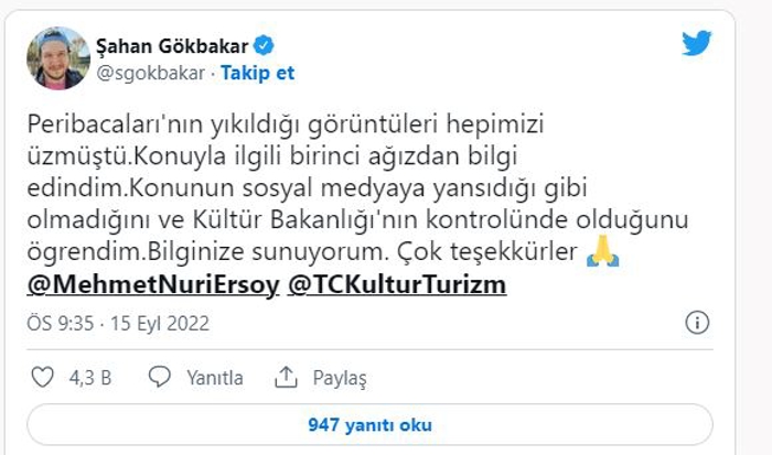 Şahan Gökbakar, sosyal medya hesabından yaptığı açıklamada, "Konunun sosyal medyaya yansıdığı gibi olmadığını ve Kültür Bakanlığı'nın kontrolünde olduğunu öğrendim. Bilginize sunuyorum. Çok teşekkürler." ifadelerini kullandı.
