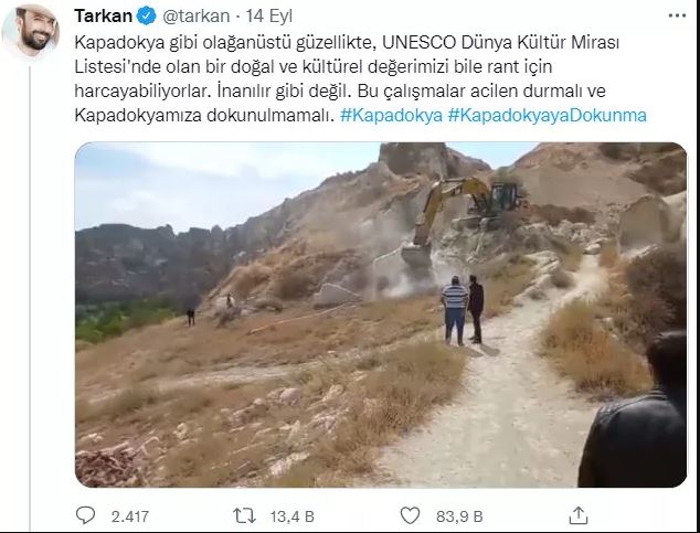 CHP Genel Başkan Yardımcısı Ali Öztunç'un, "Kapadokya'daki peri bacaları iş makineleriyle yıkılıyor" iddiası asılsız çıktı. Ortahisar Belediye Başkanı Mustafa Ateş, Nevşehir'in Ortahisar ve Göreme beldesi arasına yapılan yol çalışmasında peribacalarının iş makinesi ile yıkıldığı yönündeki iddiaları yalanladı. Fakat sanatçı Tarkan ve Şahan Gökbakar sosyal medya hesaplarından yaptıkları paylaşımlarla CHP'li Öztunç'un yalanına ortak olmuşlardı.