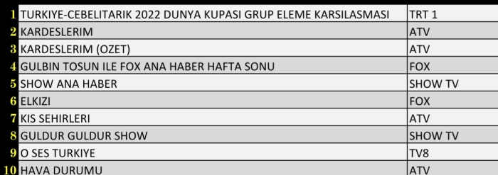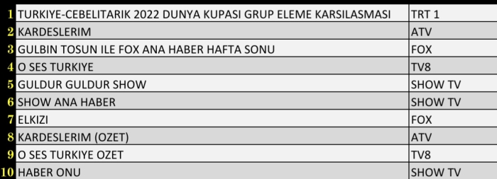 AB Grubunda ise birinci sırada Türkiye-Cebelitarık 2022 Dünya Kupası Grup Eleme Karşılaşması, ikinci sırada Kardeşlerim, üçüncü sırada ise Gülbin Tosun ile FOX Ana Haber Hafta Sonu yer aldı.