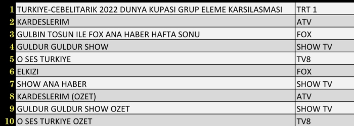 Total izleyici grubunda birinciliği Türkiye-Cebelitarık 2022 Dünya Kupası Grup Eleme Karşılaşması, ikinciliği Kardeşlerim, üçüncülüğü ise Kardeşlerim (Özet) aldı.