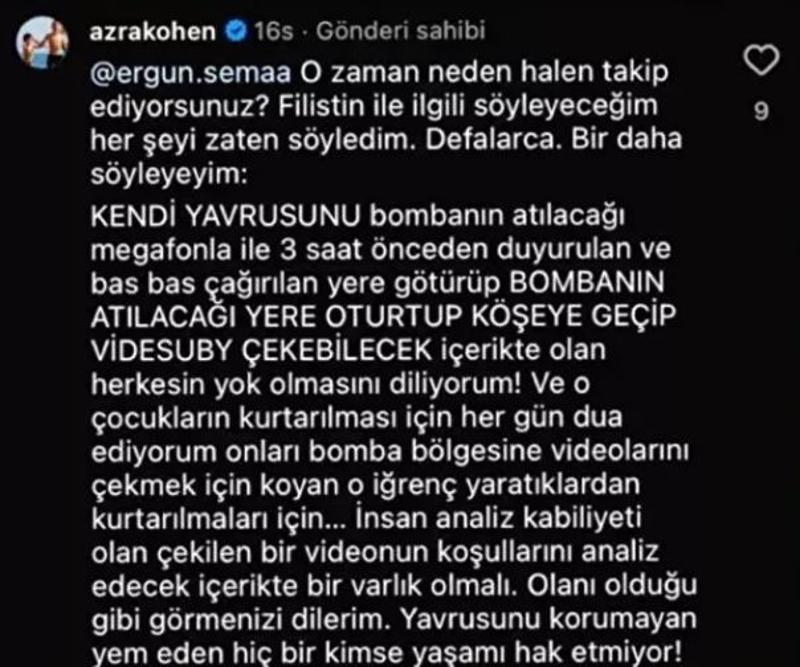 Sözde yazar Azra Kohen, yaşananlardan sonra, Refah konusunda paylaşım yapmamasını eleştiren bir takipçisine verdiği cevapta Filistinlilerin çocuklarını, '3 saat önceden uyarılar yapılmasına rağmen bombaların atılacağı yerlere bilerek götürdüğünü' söyleyerek, "Yavrusunu korumayan yem eden hiçbir kimse yaşamı hak etmiyor" dedi.