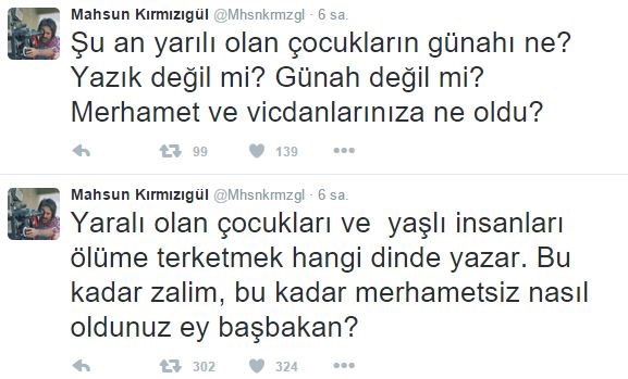 Başbakan Davutoğlu'na "Bu kadar zalim, merhametsiz oldunuz ey başbakan?" diye seslenen Kırmızıgül, PKK'nın okullara, camilere yaptığı bombalamaları ve sivil halkı hedef alan saldırılar görmezden gelmişti.